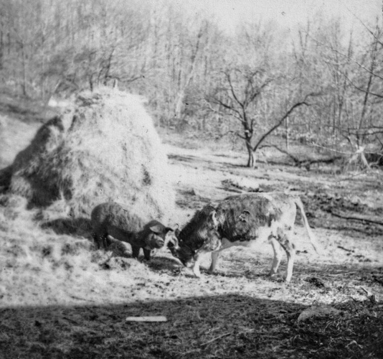 But we had Susie the Cow, and hence the photo of Susie hanging out with one of our pigs. Herd animals, lacking others of their exact species, formed a two-animal herd between them. They would sometimes break out of the fence together and go for hikes in the woods or on the local roads. We would get calls and have to come and get them, taking the cow by the collar and leading it home, the pig happily following along.